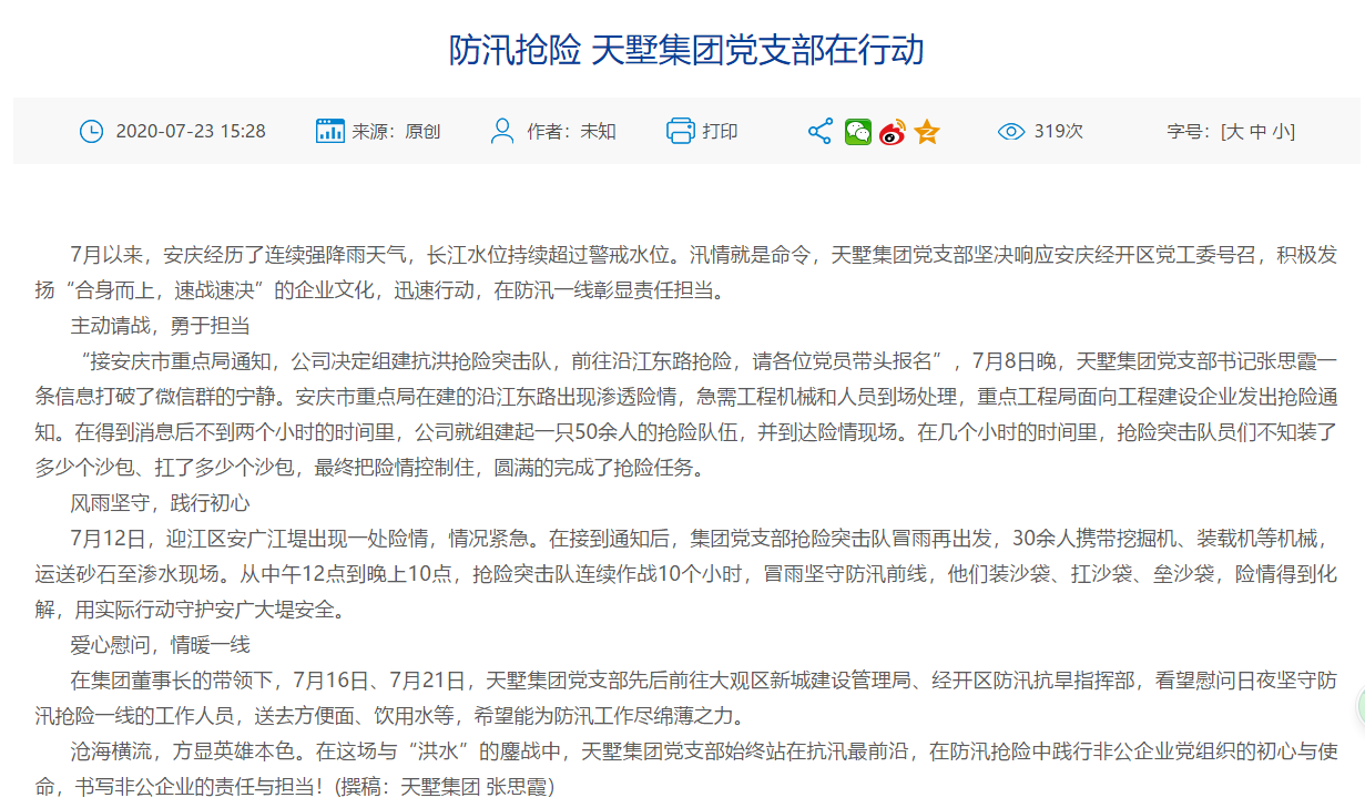 7月以來,安慶經歷了連續強降雨天氣,長江水位持續超過警戒水位。汛情就是命令,天墅集團黨支部堅決響應安慶經開區黨工委號召,積極發揚“合身而上,速戰速決”的企業文化,迅速行動,在防汛一線彰顯責任擔當,安慶市經開區管委會專題 報道了天墅抗洪搶險的行動。