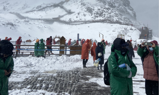 “麗江雪山天下絕,堆瓊積玉幾千疊。足盤厚地背擎天,衡華真成兩丘垤”。元代詩人李京贊美玉龍雪山的詩恐怕已不足以完全描繪和概括我所見到的玉龍雪山了。初春的清晨,古鎮上陽光明媚,平均氣溫16℃,在距古鎮不到20公里的玉龍雪山腳下卻是小雪飄飄氣溫直降零下。藍天下飄著白雪,手捧著雪花曬著太陽,再抬頭看看不遠處的雪山,披云戴雪,宛若一條蒼龍從天庭騰云駕霧而來,這磅礴的氣勢,雄偉、壯麗的景象此生我也是第一次經歷著、親吻著。一邊是陽光明媚,天空湛藍,另一邊則是雪花飛舞,白雪皚皚,山上積雪萬年不化,大自然的神奇不得不讓世人驚嘆。