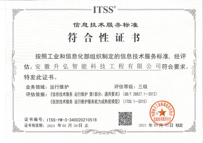 日前,升弘公司順利通過工信部中國電子工業標準化技術協會信息技術服務分會(簡稱ITSS分會)審核,獲發ITSS信息技術服務運行維護三級資質證書。