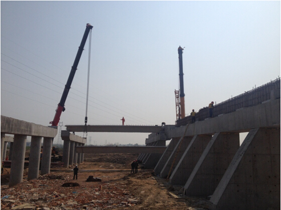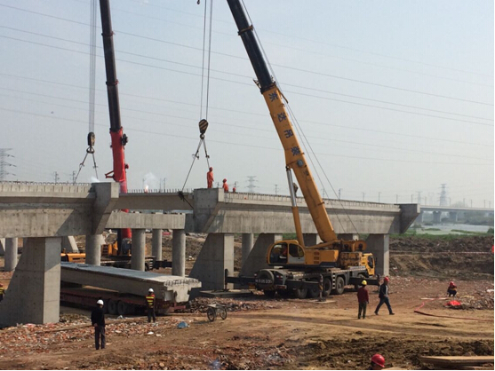 本次架梁施工共需架設54片長20米箱型梁,計劃一周之內完工。經過全體施工人員的共同努力,首日已架設了9片梁板。