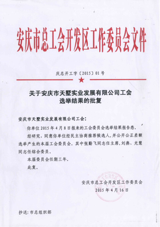 日前,安慶市總工會開發區工作委員會就我公司呈報的工會委員會選舉結果作出批復,同意我公司經民主協商推薦候選人,并公開公正差額選舉產生的本屆工會委員會。其中,張勤飛同志任主席,劉燕、光慧同志任綜合委員。本屆委員會任期時間為三年。