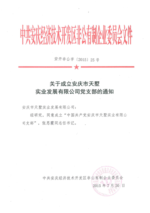 7月,恰逢中國共產黨成立94周年的生日,我公司成立黨支部的申請終獲批復,經上級黨委研究決定,同意成立“中國共產黨安慶市天墅實業發展有限公司黨支部”,張思霞同志任黨支部書記。