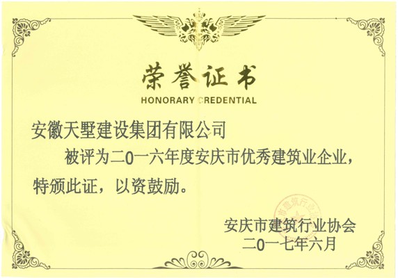 近日,天墅建設(shè)集團(tuán)公司再次被評為“二O一六年度安慶市優(yōu)秀建筑業(yè)企業(yè)”。公司多名項目經(jīng)理在工程建設(shè)項目管理工作中,表現(xiàn)優(yōu)秀,成績突出,被授予二O一六年度“安慶市建筑業(yè)企業(yè)優(yōu)秀項目經(jīng)理”榮譽(yù)稱號。