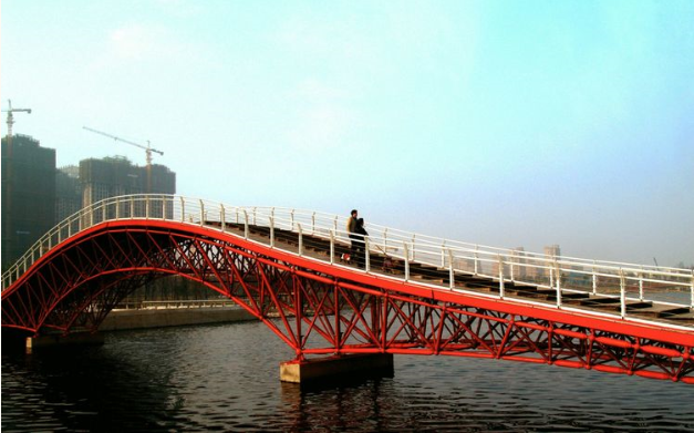 新河水系橋梁工程旨在為解決行人過河問題,改善道路交通環境、提高公園內部通行能力及搭載河道景觀欣賞功能。根據規劃設計要求,在安慶康熙河設計人行橋7座,其中1號橋、2號橋和5號橋為桁架結構,3號橋、6號橋、7號橋為鋼箱梁結構,4號橋是網架結構。7座橋梁中,2號橋和4號橋采用中國紅色彩,其余橋均為白色。工程投入使用后,為安慶市構筑低碳樂活、引領風尚的風情水岸劃上濃重一筆。
